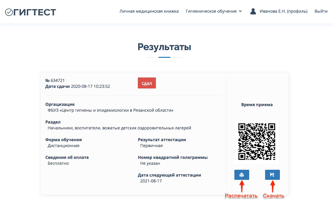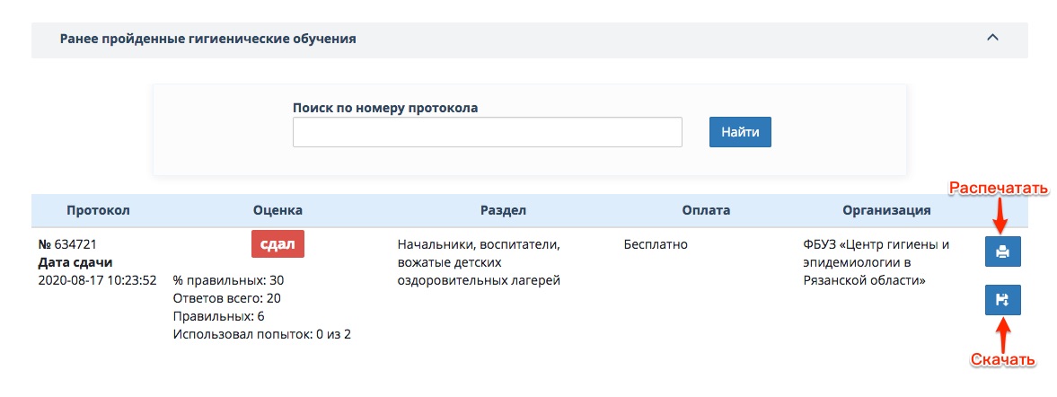 Ответ: Зайдите в раздел «Гигиеническое обучение» -> «Результаты». Здесь можно распечать или скачать протокол на компьютер.