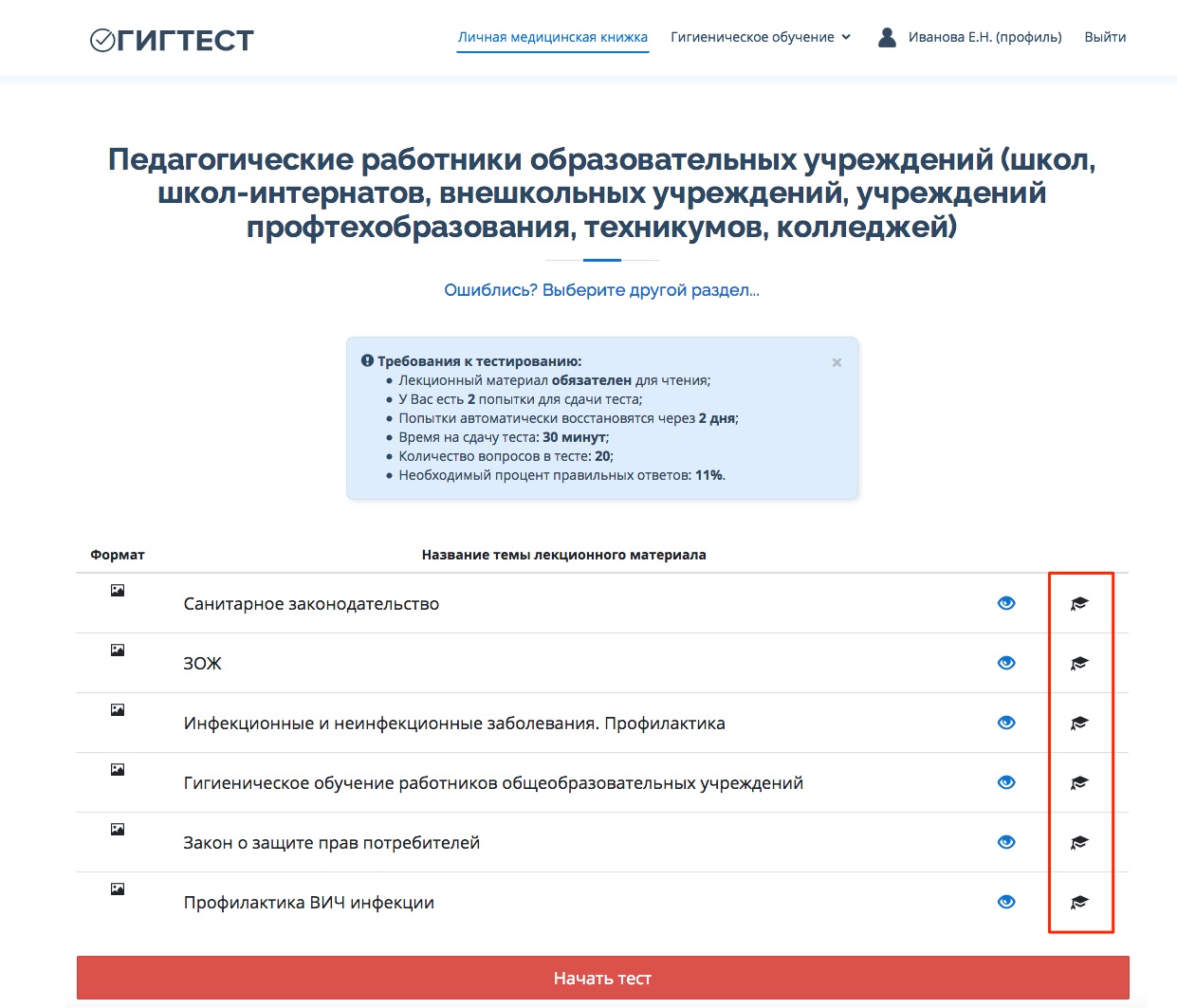 1. Если в Вашем регионе указано требование «лекционный материал обязателен для чтения» (информационный блок на голубом фоне), то для того чтобы пройти тестирование, необходимо прочитать все лекции. Прочитанные лекции отмечаются пиктограммой магистерская шляпа. Проверьте, все ли лекции у Вас прочитаны (см.рисунок).