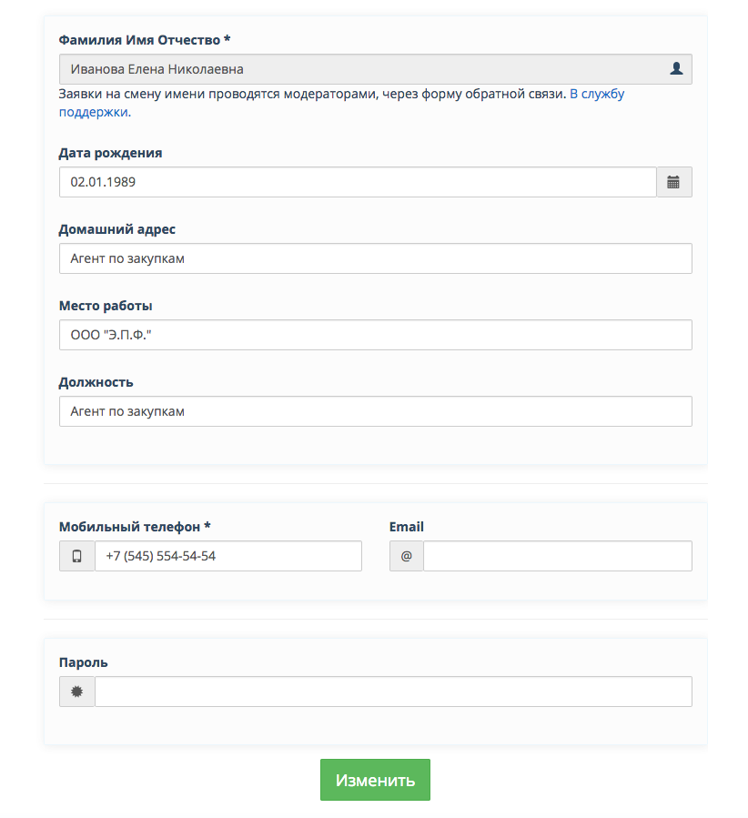 Вы перейдете в свой профиль, где можно отредактировать все введенные при регистрации данные, кроме ФИО. Исправляем, что нужно и нажимаем кнопку «Изменить».