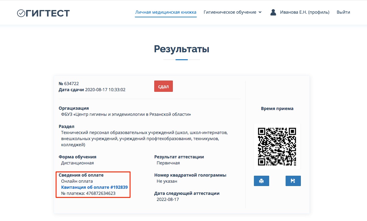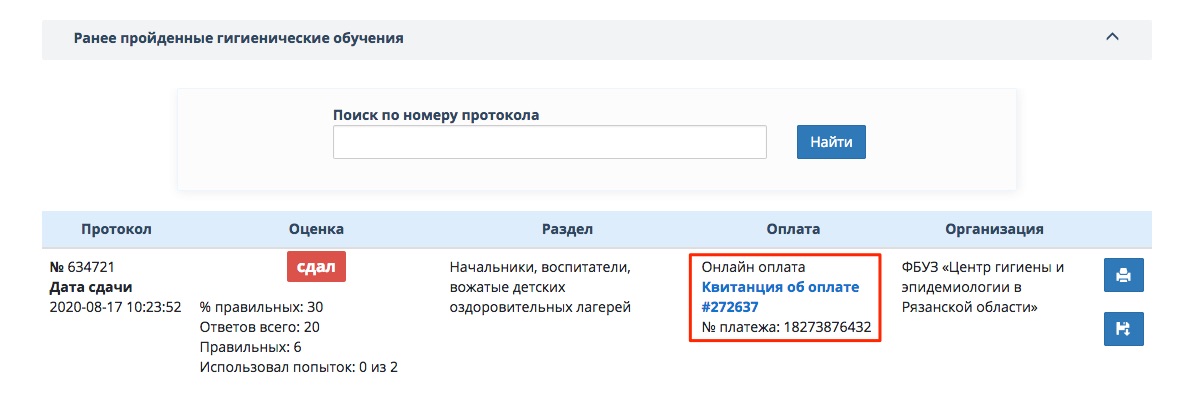 Ответ: Зайдите в раздел «Гигиеническое обучение» -> «Результаты». Напротив успешного протокола в столбце «Оплата» будет ссылка на скачивание квитанции.