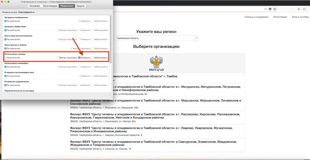 • Зайдите на сайт https://gigtest.ru/, нажмите на значок «Защищено» (или зеленый замочек) и проверьте, что в списке есть «Камера» и напротив нее указано «Разрешить».